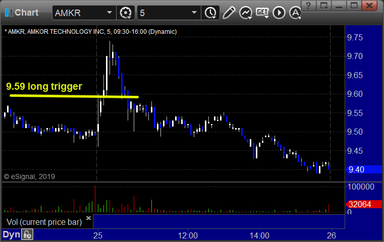 From the report, AMKR triggered long (without market supportdue to opening 5 minutes) and didn't quite work enough: