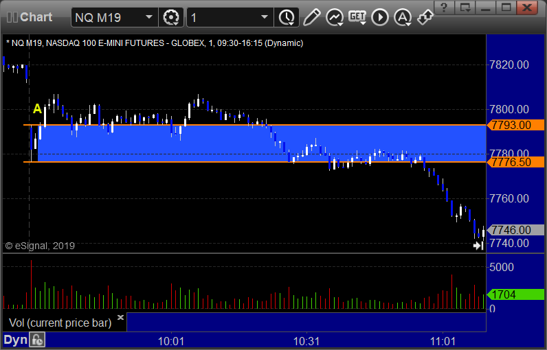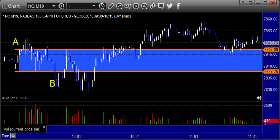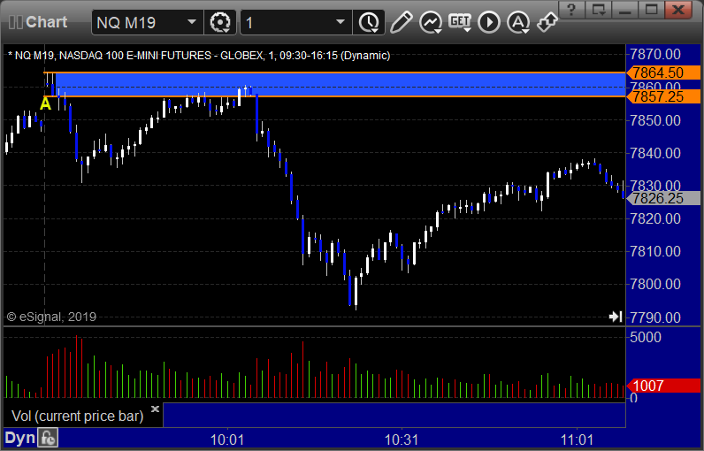 NQ Opening Range Play triggered long at A and worked, triggered short at B and stopped: