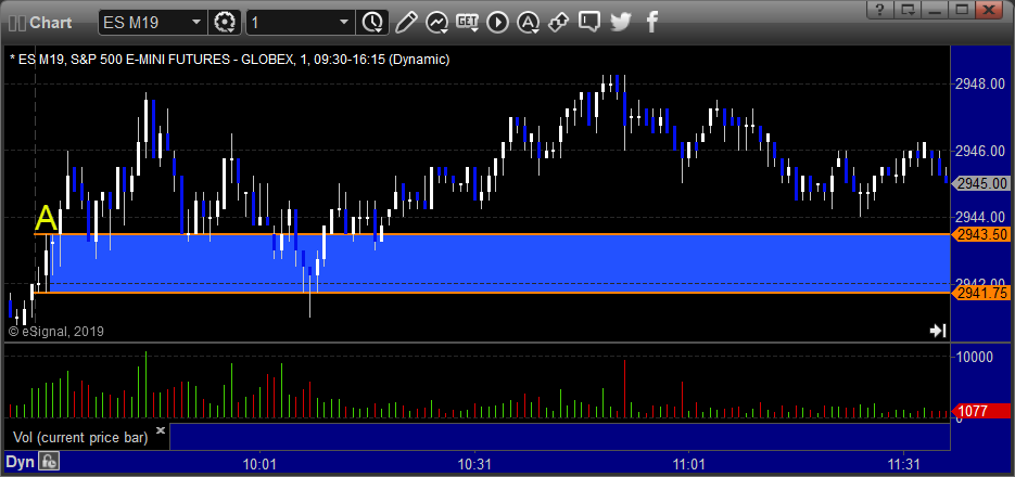 ES Opening Range Play triggered long at A but we don't take it by rule because we were already short NQ and this wasn't into the gap, triggered short at B and worked enough for a partial: