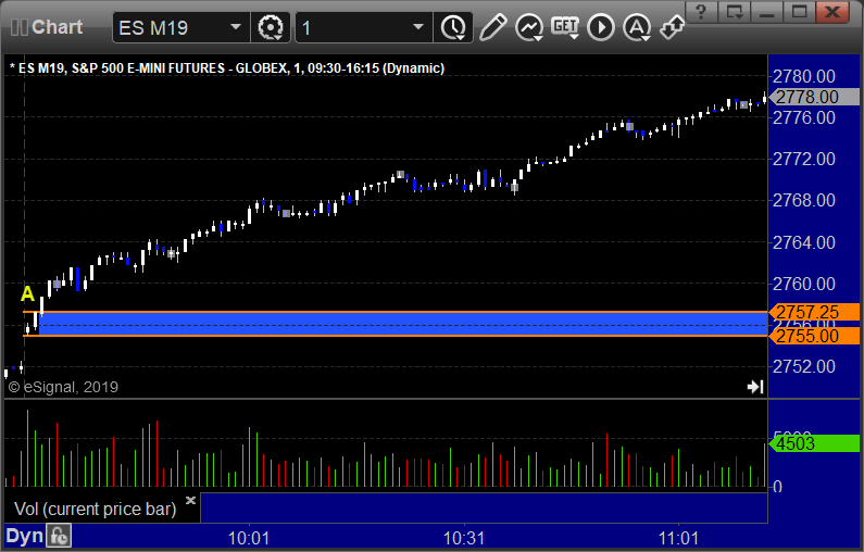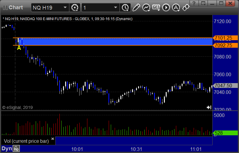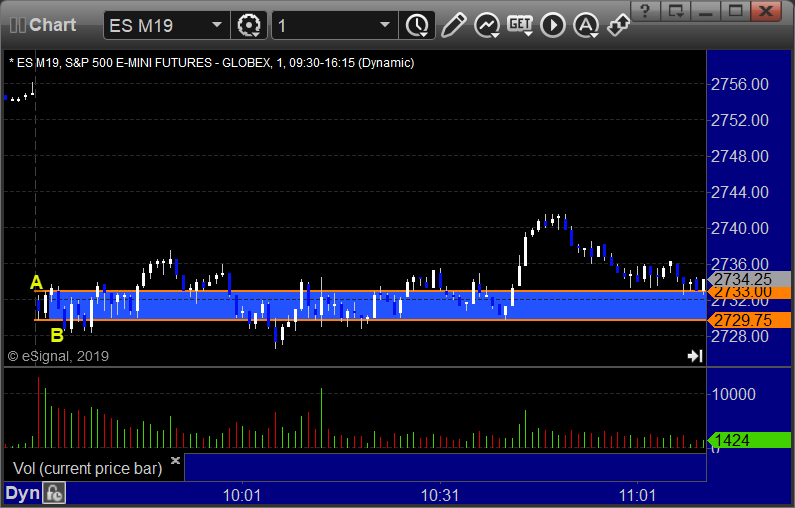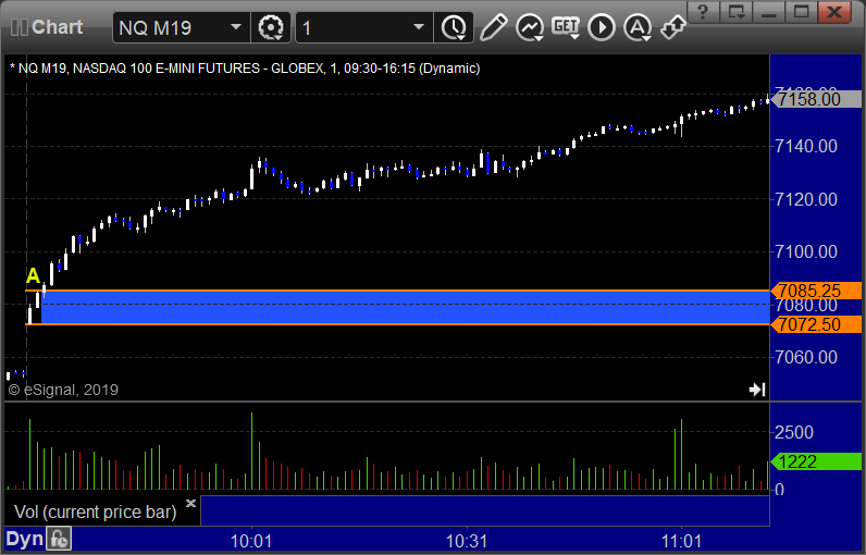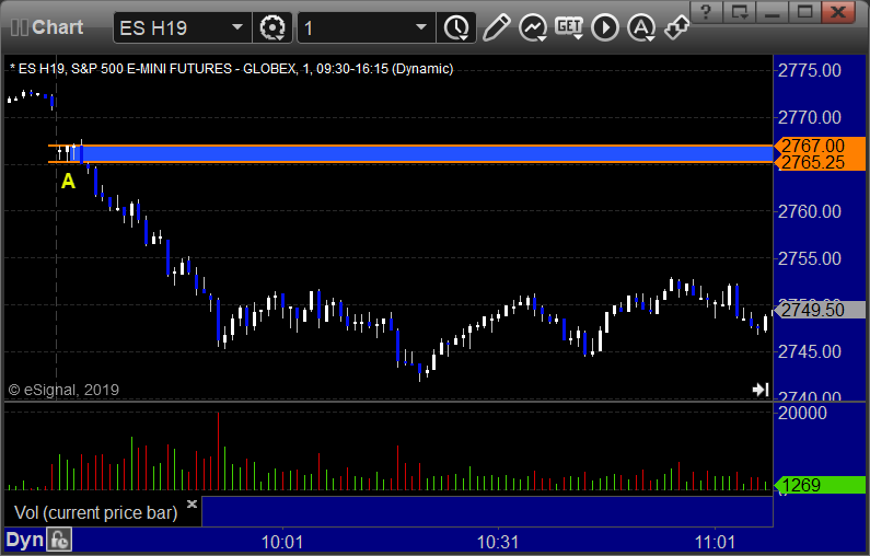 ES Opening Range Play triggered long at A and stopped, triggered short at B but not valid because we were long the NQ and this wasn't into the gap: