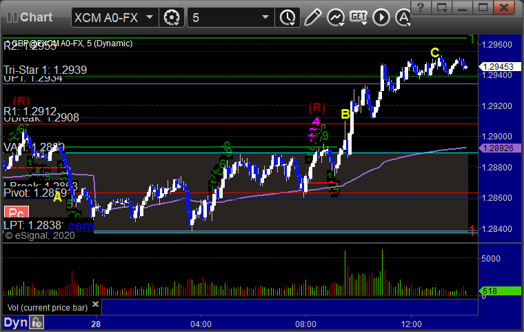 Triggered short at A and stopped. Triggered long at B, hit first target at C, still holding second half with a stop under UPT:
