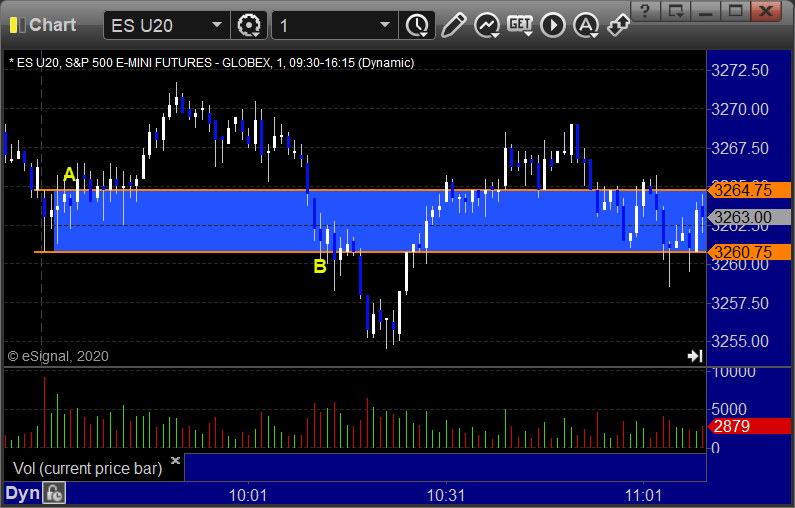 ES Opening Range Play triggered long at A and stopped, triggered short at B and worked:
