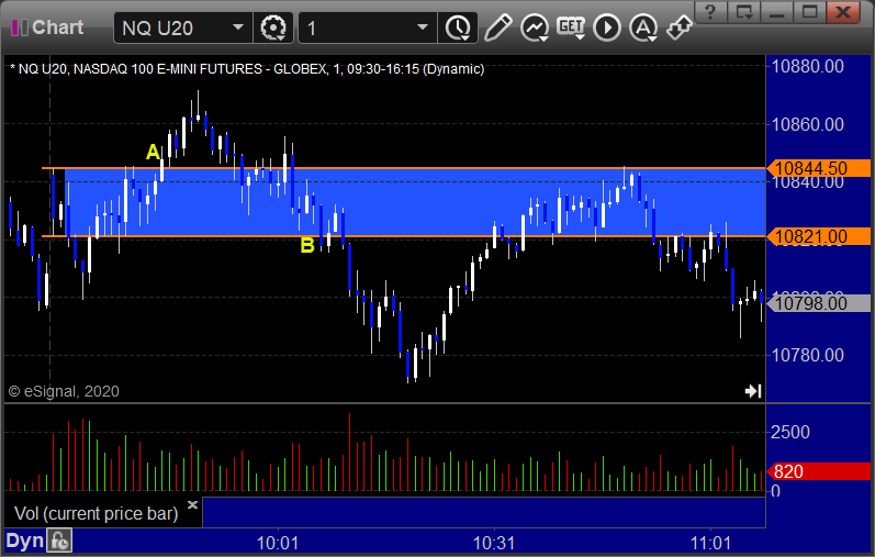 NQ Opening Range Play triggered long at A and short at B but too far out of range to take: