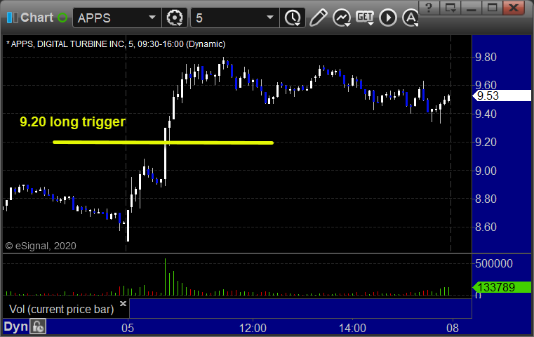With each stock's recap, we will include a (with market support) or (without market support) tag, designating whether the trade triggered with or without market directional support at the time. Anything in the first five minutes will be considered WITHOUT market support because market direction cannot be determined that early. ETF calls do not require market support, and are thus either winners or losers.