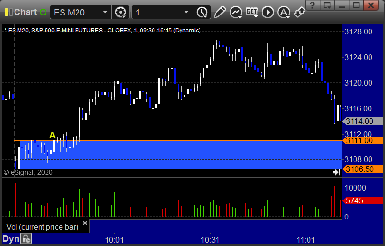 ES Opening Range Play triggered long at A and stopped, triggered short at B and stopped: