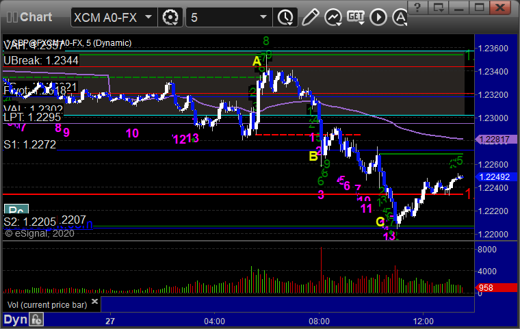 Triggered long at A, hit first target at B, still holding second half with a stop under C at 1.2300: