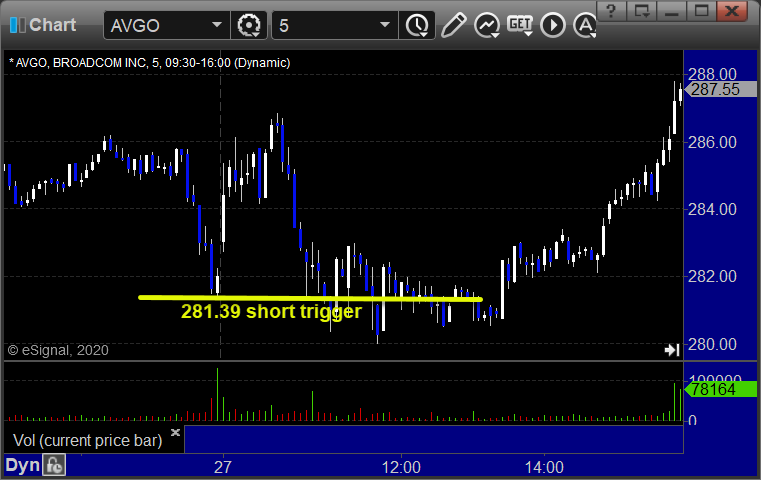 From the Messenger/Tradesight_st Twitter Feed, AVGO triggered short (with market support) and didn't work: