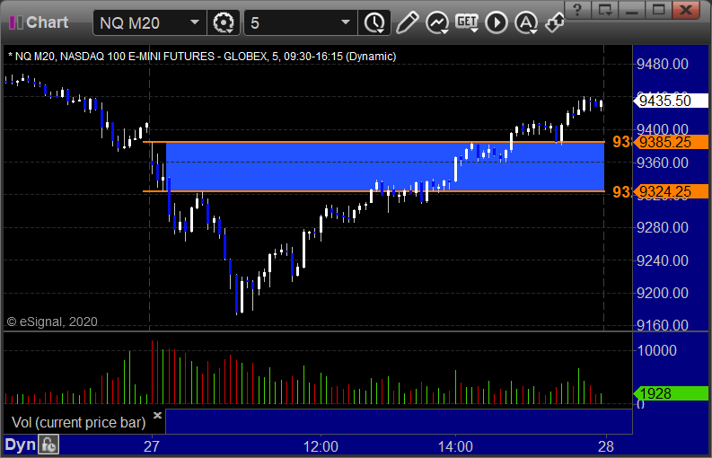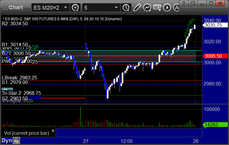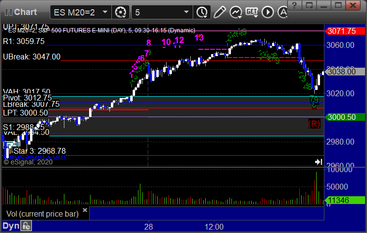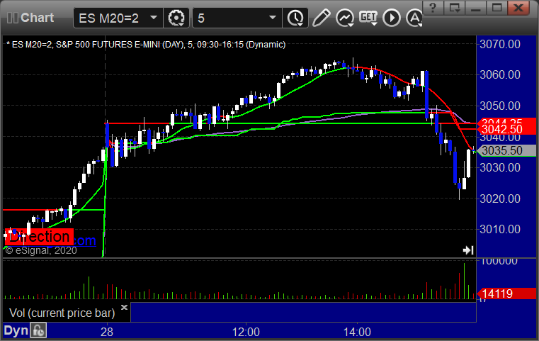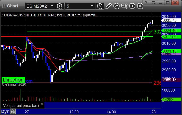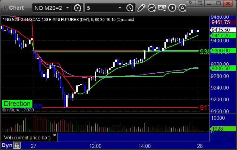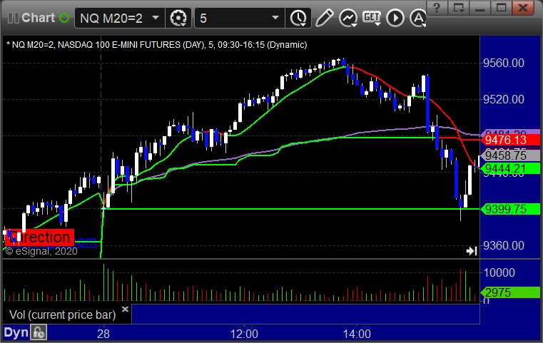 As usual, let's start by taking a look at the ES and NQ with our market directional lines, VWAP, and Comber on the 5-minute chart from today's session: