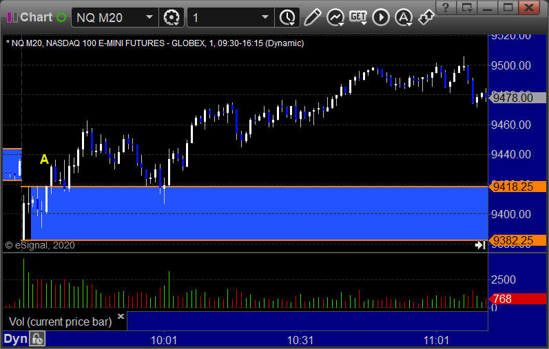 NQ Opening Range Play triggered long at A but too far out of range to take: