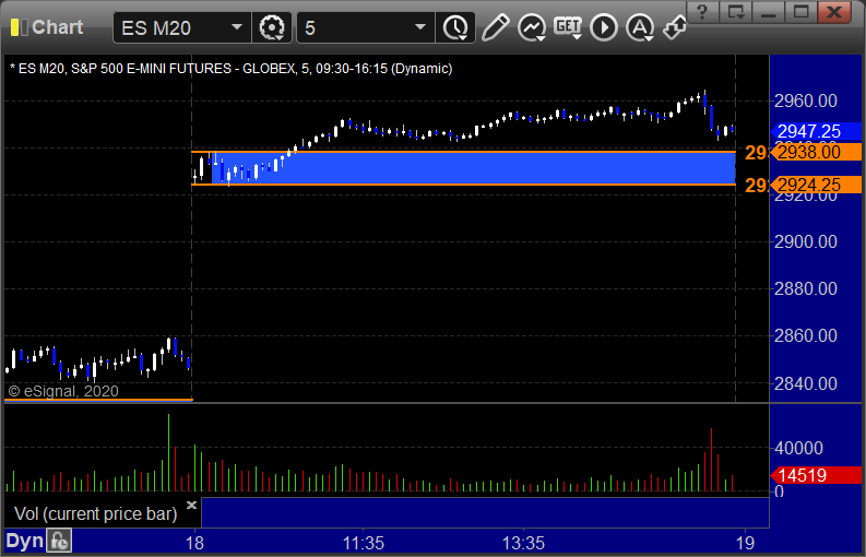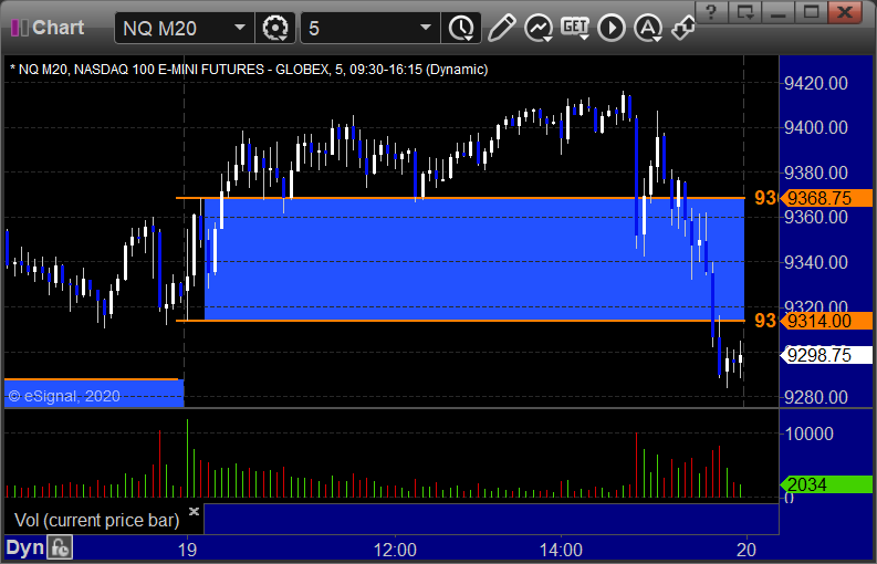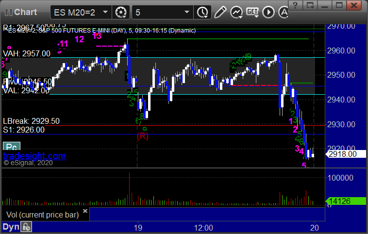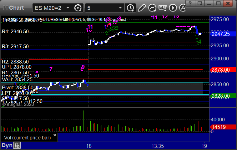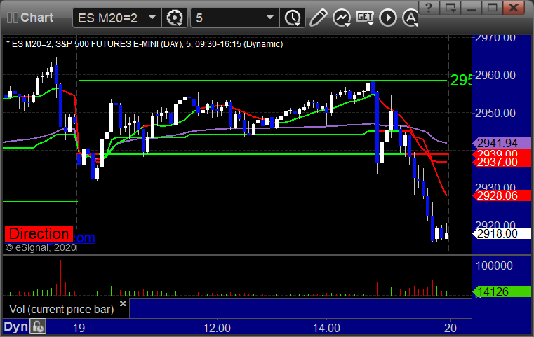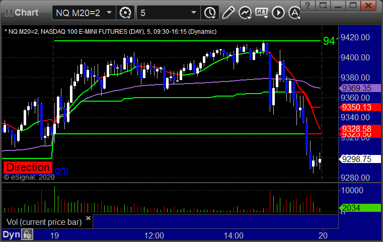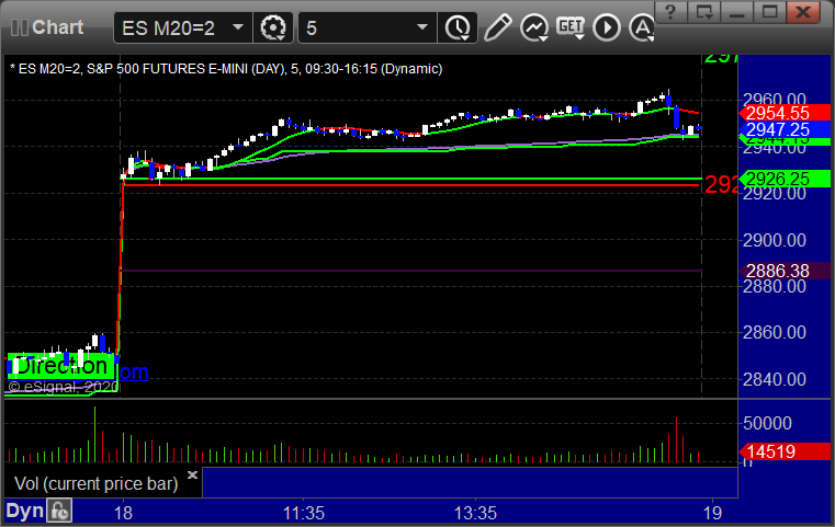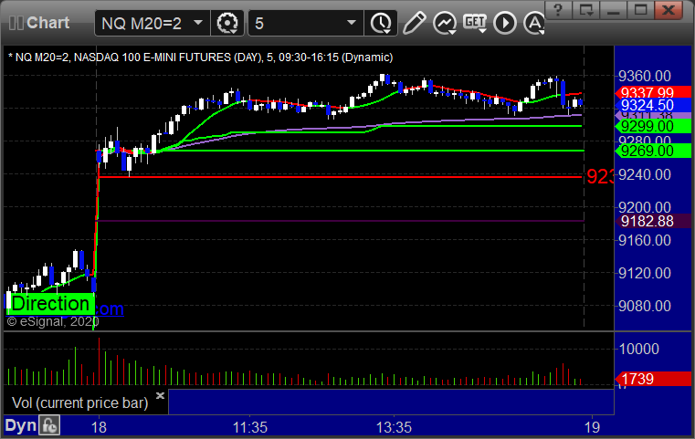As usual, let's start by taking a look at the ES and NQ with our market directional lines, VWAP, and Comber on the 5-minute chart from today's session: