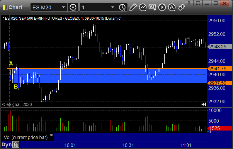 ES Opening Range Play triggered long at A and stopped, triggered short at B and worked: