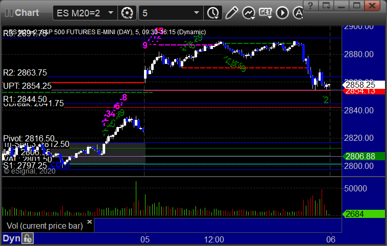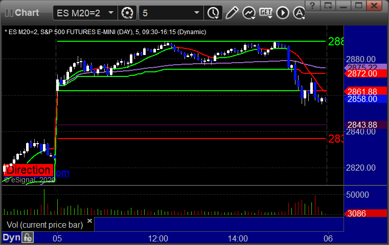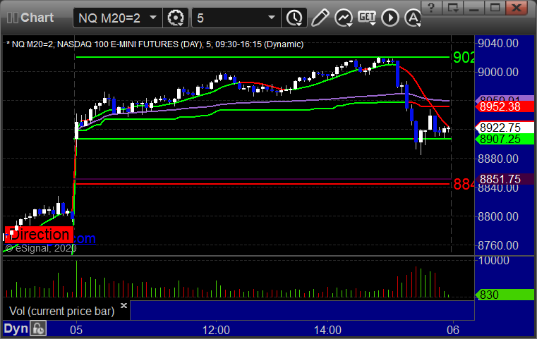 As usual, let's start by taking a look at the ES and NQ with our market directional lines, VWAP, and Comber on the 5-minute chart from today's session:
