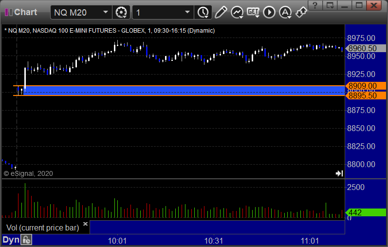 NQ Opening Range Play triggered long at A and short at B, but both were too far out of range to take: