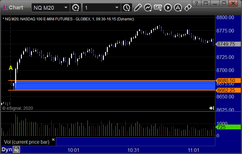 NQ Opening Range Play triggered long at A but too far out of range to take: