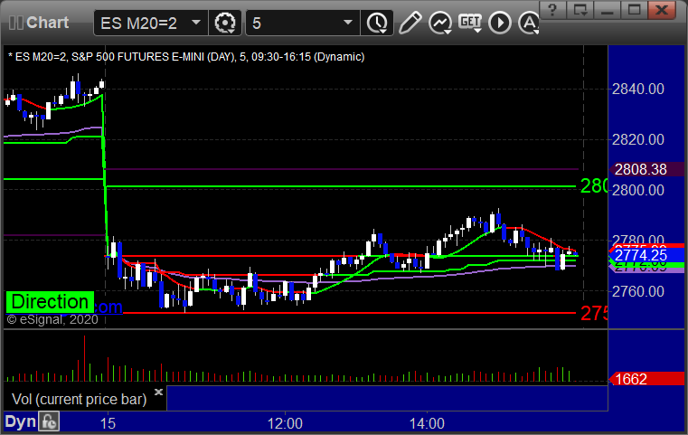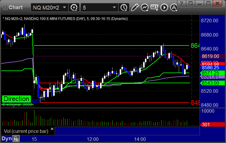 As usual, let's start by taking a look at the ES and NQ with our market directional lines, VWAP, and Comber on the 5-minute chart from today's session: