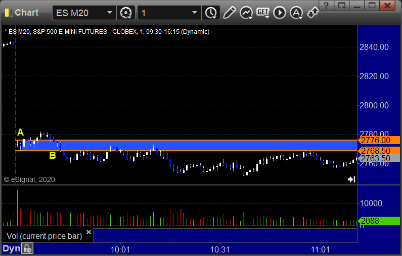ES Opening Range Play triggered long at A and stopped under the midpoint, triggered short at B and worked: