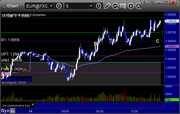 Triggered long at A, hit first target at B, still holding second half with a stop under R1 at C:
