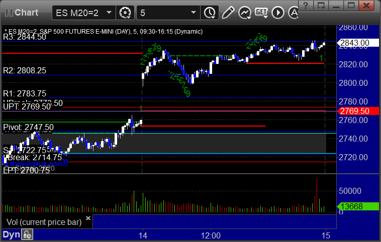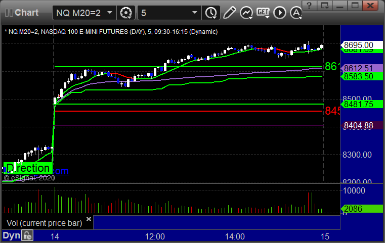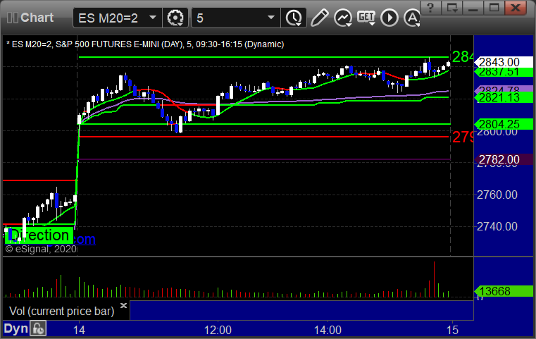 As usual, let's start by taking a look at the ES and NQ with our market directional lines, VWAP, and Comber on the 5-minute chart from today's session: