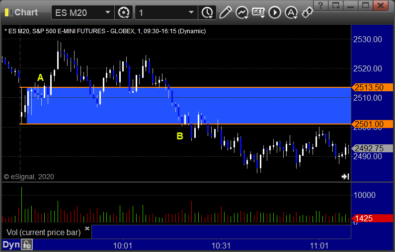 ES Opening Range Play triggered short at A but too far out of range to take, triggered long at B and worked: