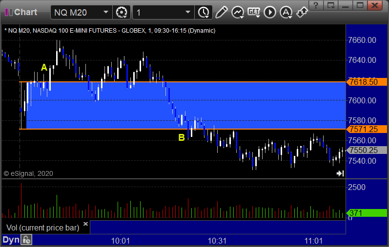 NQ Opening Range Play triggered long at A,and triggered short at B but definitely too far out of range: