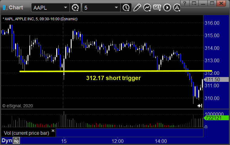 From the Messenger/Tradesight_st Twitter Feed, Rich's AAPL triggered short (with market support) and worked a little: