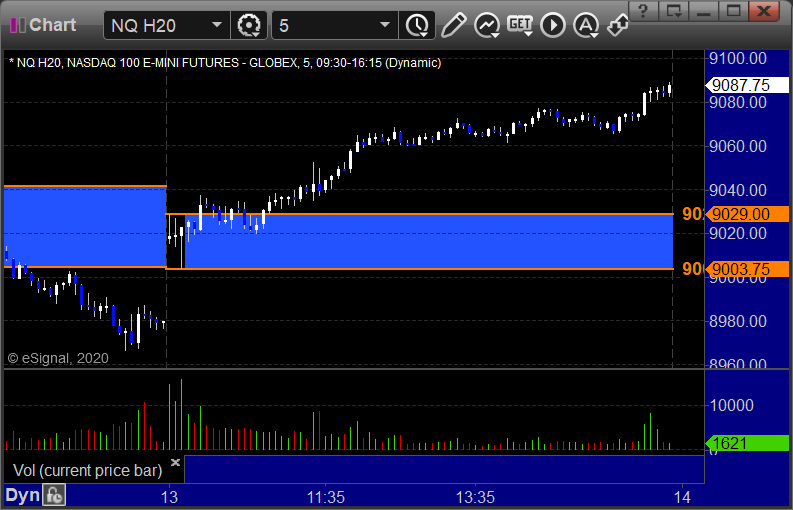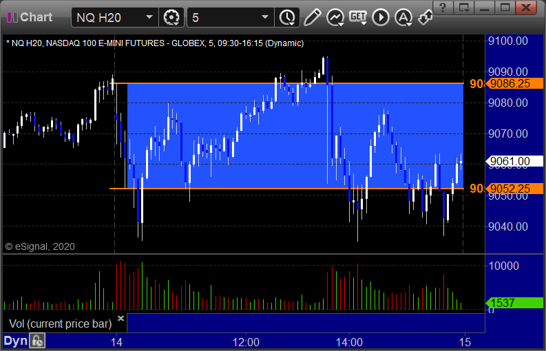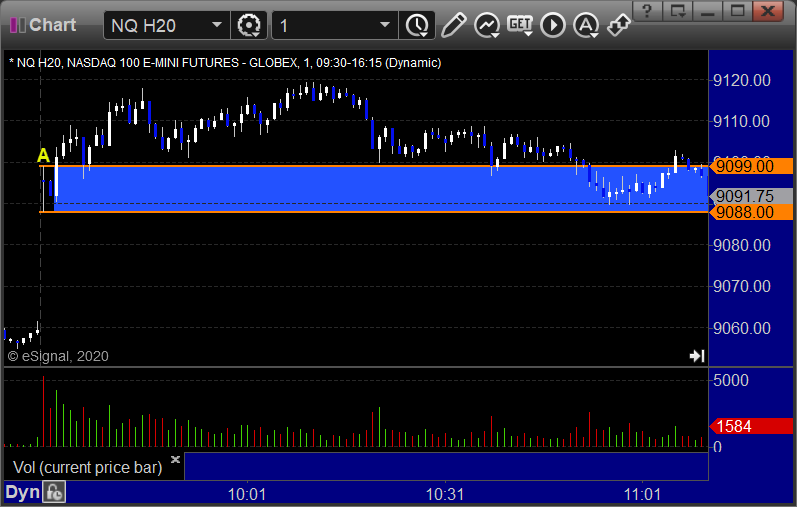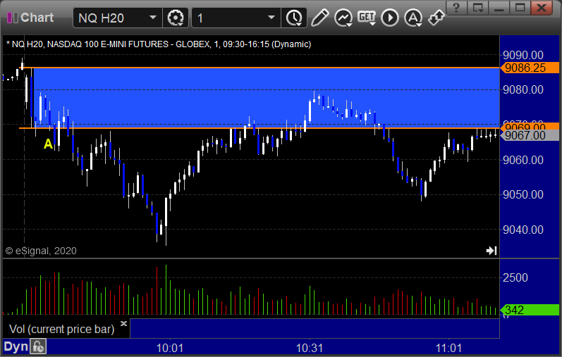 NQ Opening Range Play triggered short at A and would have worked, but too far out of range to take:
