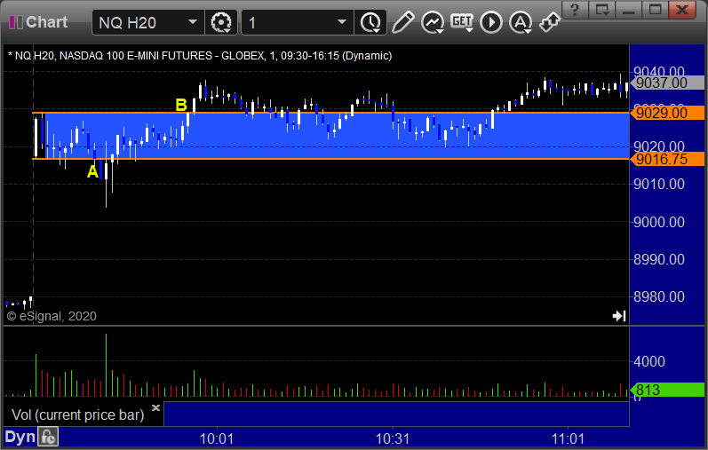 NQ Opening Range Play triggered short at A and worked enough for a partial, triggered long at B and worked enough for a partial: