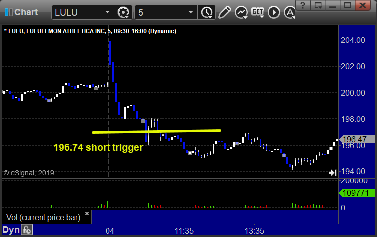 From the Messenger/Tradesight_st Twitter Feed, LULU triggered short (with market support) and worked: