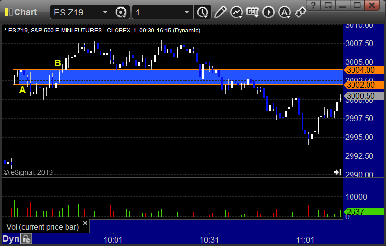 ES Opening Range Play triggered long at A and stopped, triggered short at B and worked: