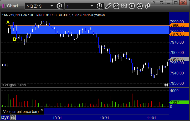 NQ Opening Range Play triggered long at A and stopped, triggered short at B and worked enough for a partial: