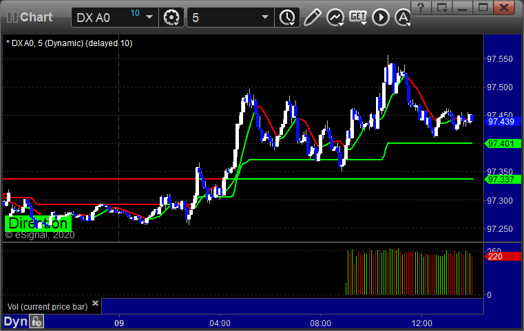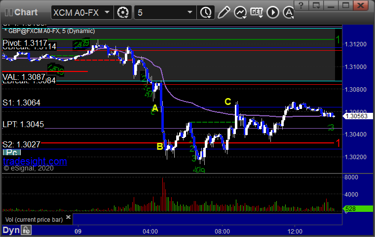A small winner for the session. See GBPUSD section below. Here’s a look at the US Dollar Index intraday with our market directional lines: GBPUSD: Triggered short at A, hit first target at B, stopped second half over entry at C: PrevNext