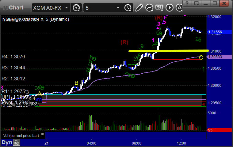 Triggered long at A, hit first target at B, still holding second half with a stop under 1.3100 at C: