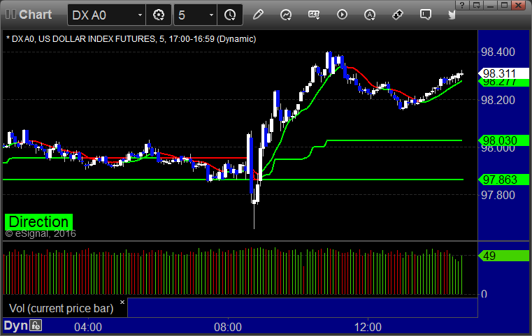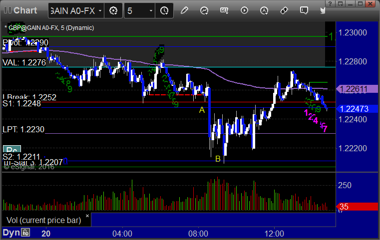 Small winner for the session. Still half size. See GBPUSD below. Still boring. Here’s a look at the US Dollar Index intraday with our market directional lines: GBPUSD: Triggered short at A, hit first target at B, stopped second half over the entry: PrevNext