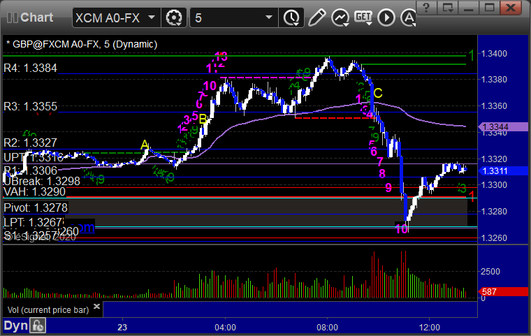 A winner for the session. See the GBPUSD section below. Here’s a look at the US Dollar Index intraday with our market directional lines: GBPUSD: Triggered long at A, hit first target at B, stopped second half in the money at C: PrevNext