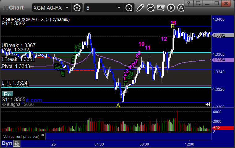 No triggers for the day but see GBPUSD section below. Here’s a look at the US Dollar Index intraday with our market directional lines: GBPUSD: Exactly hit the short trigger at A, barely triggered part of the trade long at B and did nothing: PrevNext