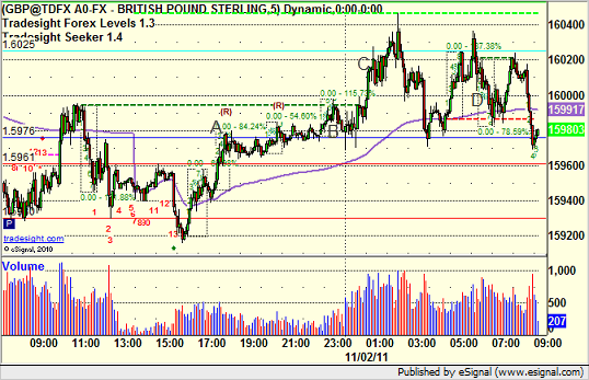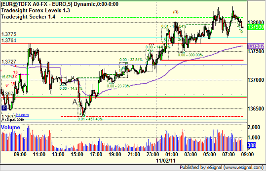 This was a half size night, but there was a short trigger on the EURUSD before the Asian session even started, which would have been quarter size under our rules if you even took it that early. Triggered short at A, came within five pips of first target, and stopped: