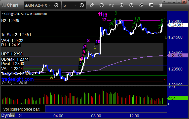 Triggered short at A and stopped. Triggered long at B, hit first target at C, kept going, still holding second half with a stop under D: