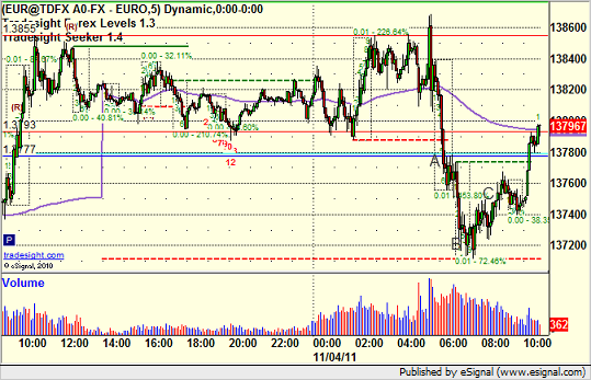 After a flat overnight, triggered short in the morning at A, hit first target at B for 45-50 pips, then lowered stop twice and stopped in the money at C to close the week: