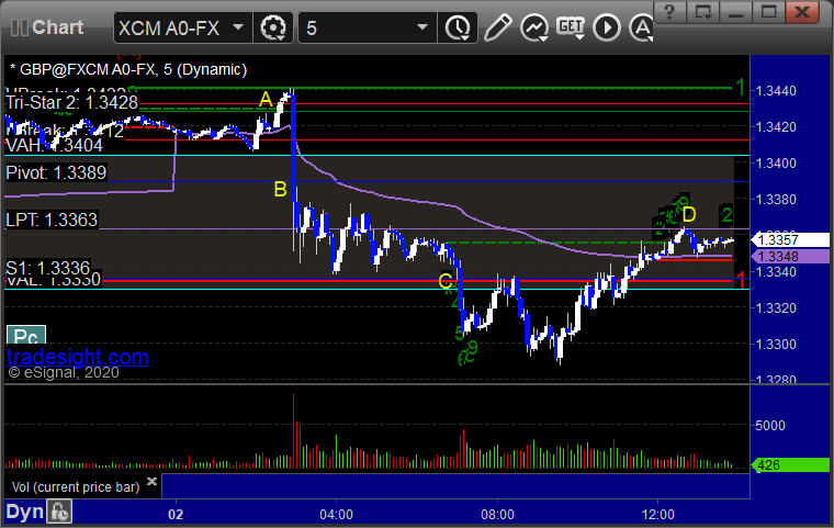 Triggered long at A and stopped. Triggered short at B, hit first target at C, still holding second half with a stop over LPT at D: