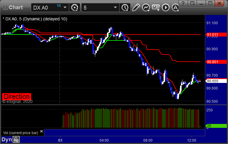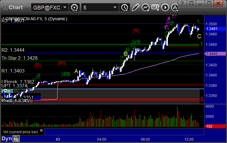 A winner for the session, still going. See GBPUSD section below. Here’s a look at the US Dollar Index intraday with our market directional lines: GBPUSD: Triggered long at A, hit first target at B, still holding second half with a stop under R2: PrevNext