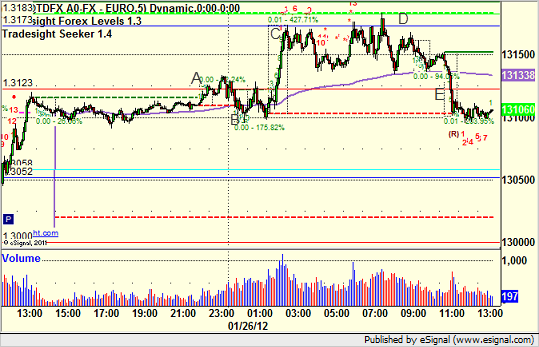 New trade triggered long at A and stopped just barely at B, which was a disappointment since it later worked precisely to the first target at C. I should also point out that the high of the session at D is exactly a tri-star level from our list. Stopped second half of the trade from the prior session at E for a nice gain: