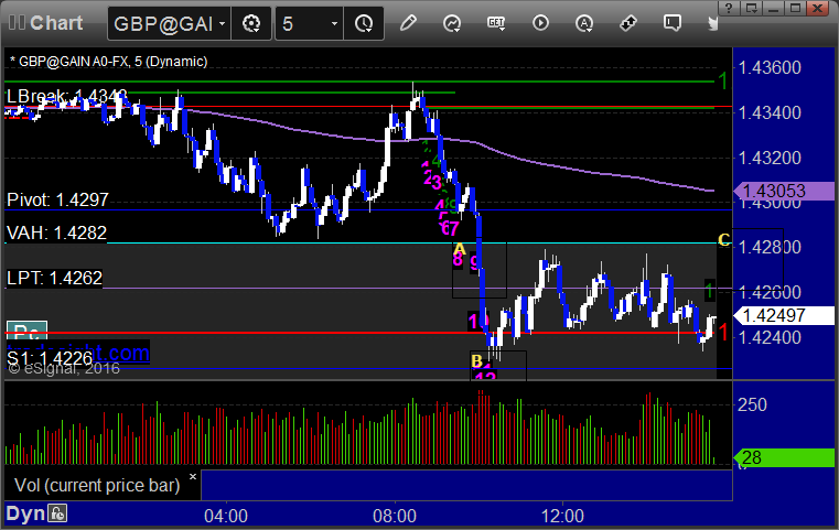 Triggered short at A, hit first target at B, still holding second half with a stop over entry at C: