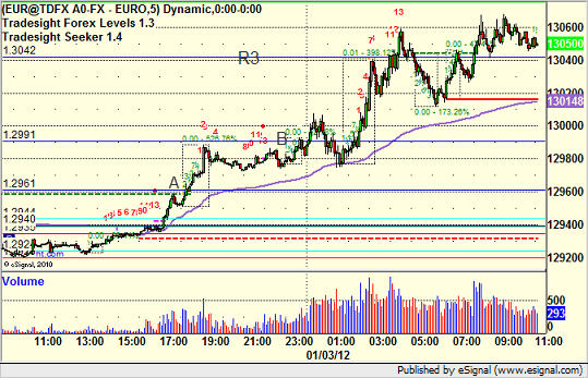 Triggered long at A, hit first target at B, raised stop twice and currently have stop under R3 and holding over: