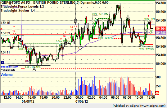 Triggered short early (half size if you were ready) at A and stopped. Triggered long at B and stopped at C: