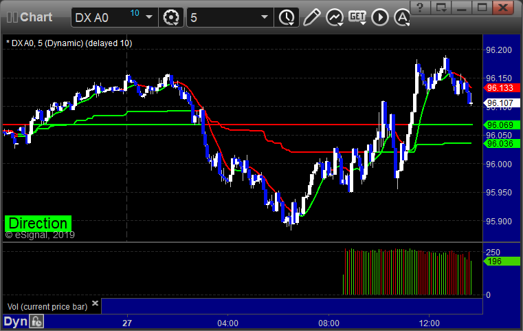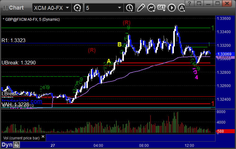 A winner for the session. See GBPUSD section below. Here’s a look at the US Dollar Index intraday with our market directional lines: GBPUSD: Triggered long at A, hit first target at B, still holding second half: PrevNext