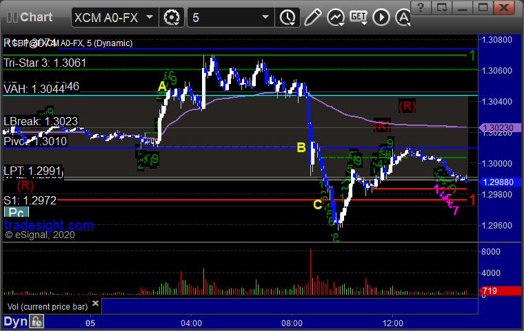 Triggered long at A and stopped. Triggered short at B, hit first target at C, still holding second half with a stop over the Pivot:
