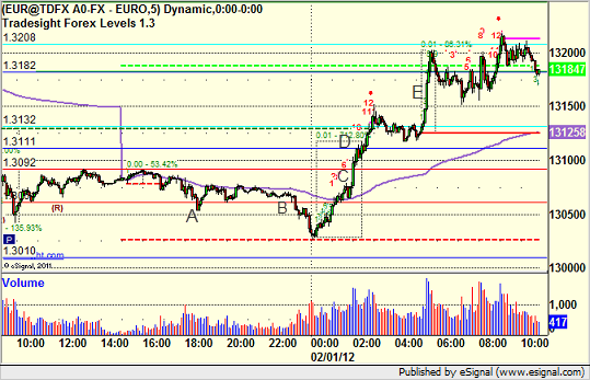 Came in still short and in the money on the EURUSD, second half of the trade from the prior session, with a stop over the new UBreak red line. New trade triggered short early at A, but gave you until B to take normal size without stopping, then stopped at C. Second half of prior day’s trade stopped in the money after that. Triggered long at D, hit first target at E, and holding 70 pips in the money with a raised stop as I write this: