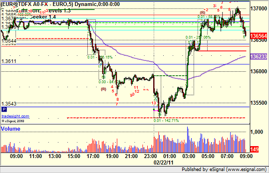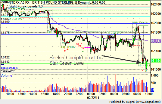 Now, let’s discuss this for a minute. At point E on that above chart, I had stated in our Trading lab that we were 9 bars down on the Seeker tool with a big move and hitting the tri-star level, so that would probably be it for the day. Here’s a screenshot about an hour later: