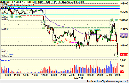 Triggered short early at A, hit first target at B, and then went flat for the European session and stopped me out of final piece at C. Note the retest of the entry exactly at D and then it rolled over to the tri-star level at E: