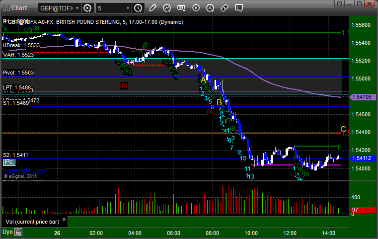Triggered long early before this chart even begins over UBreak and that stopped. Triggered short at A, hit first target at B, and still holding the second half with a stop at C: